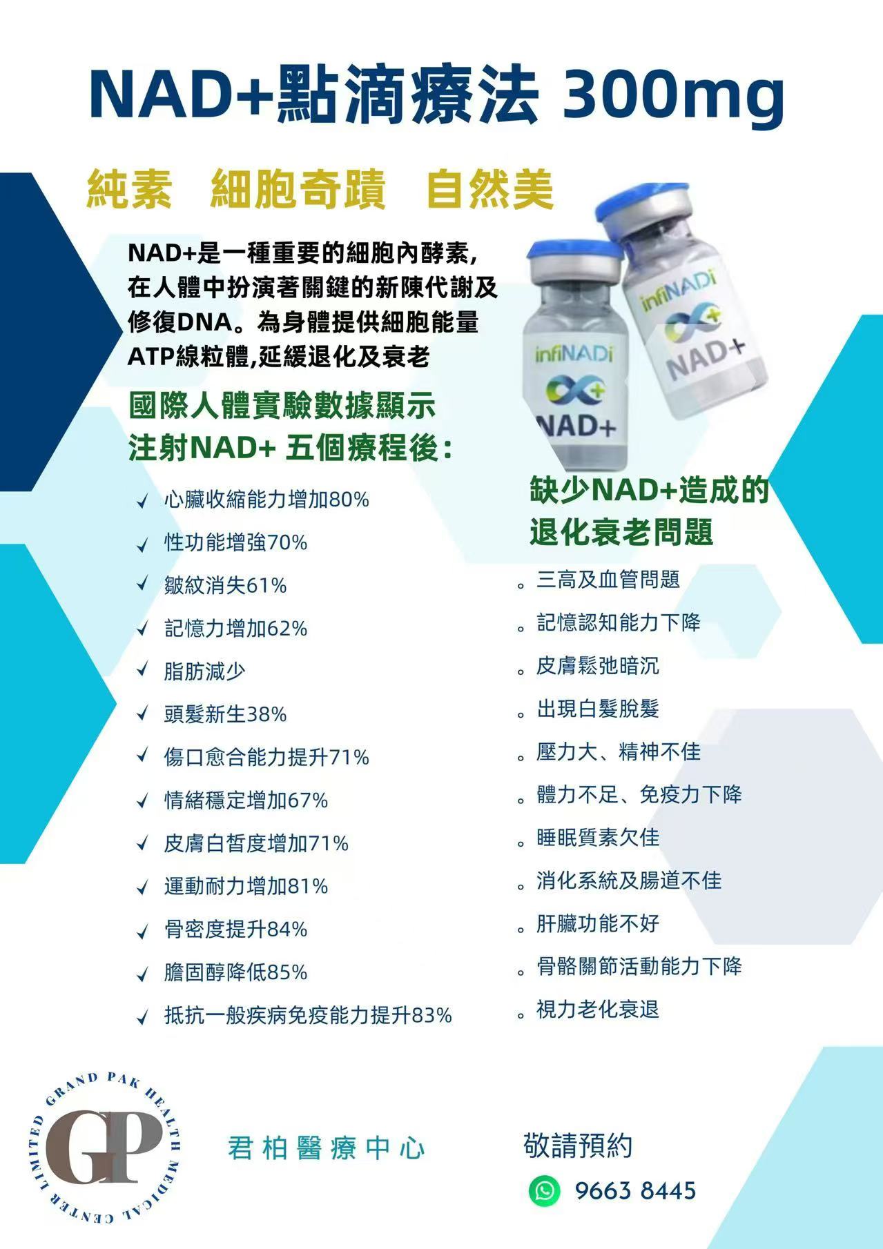 NAD+(菸酰胺腺嘌呤二核苷酸)是細胞能量代謝的關鍵分子。我們的 NAD+ 療程透過靜脈注射或口服補充,幫助提升細胞活力、改善代謝功能、增強免疫力及延緩衰老。